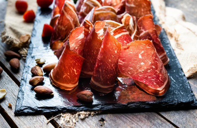 Cecina meat is made from the hind legs of Spanish cattle and is traditionally salted, dried and smoked over oak chippings. The thinly sliced meat is often eaten by itself, but it also makes for an excellent bread topping.
